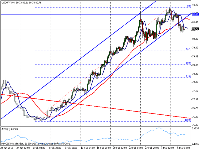 Коррекция пары USD/JPY, похоже, будет иметь более затяжной характер, причиной чему послужили разочаровывающие известия из Китая, где прогноз по ВВП на год был пересмотрен в сторону понижения (до 7.5%). Доллар относительно иены по итогам дня потерял 66 пунктов, закрывшись на отметке 80.89, что практически соответствует достижению линии поддержки восходящей тенденции от роста с начала февраля.